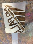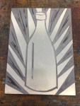 Before working on the Steel Plate we attached a handle to be used in the Electro Etching process. I then worked on my piece of Steel plate preparing it for etching in much the same way as with the Saline Sulphate Etching, this time using both Fablon and Shellace. Then, once ready the plate was placed into an Electro Etching bath. The Workshop Notes cover the Electro Etching process in detail.