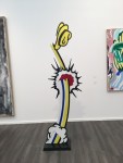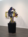 Expressionist Head reflects rootings of German Expressionist prints because of its “angular anatomies and bold contours”, but Lichtenstein swapped out his characteristic Ben-Day dots with hatch marks to in his favored primary colors. Like many Lichtenstein sculptures, this set is essentially two-dimensional rather than volumetric.[3]
