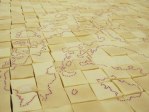 Across a grid of 2,400 square blocks of soap, wavering lines of tiny red glass beads embedded into the surface trace out an unfamiliar map.it depicts the disconnected territories agreed to be returned to Palestinian control in the Oslo Accords of 1993.