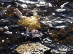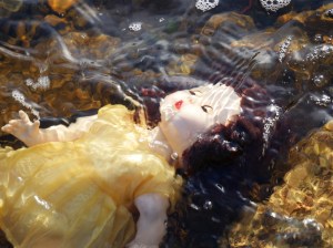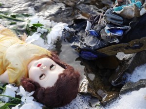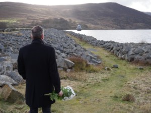 My first task for this project was to visit Llyn Celyn and take some photography. I was a little prepared in that I had purchased a doll from the 1950’s (of the time) to use as an analogy for things that get left behind when someone is evicted. I also purchased some flowers as I feel deeply moved by the fact that there are graves untouched that have been left behind. I decided to use the same character as the previous set of work as this will create some continuity between the two pieces for the future.